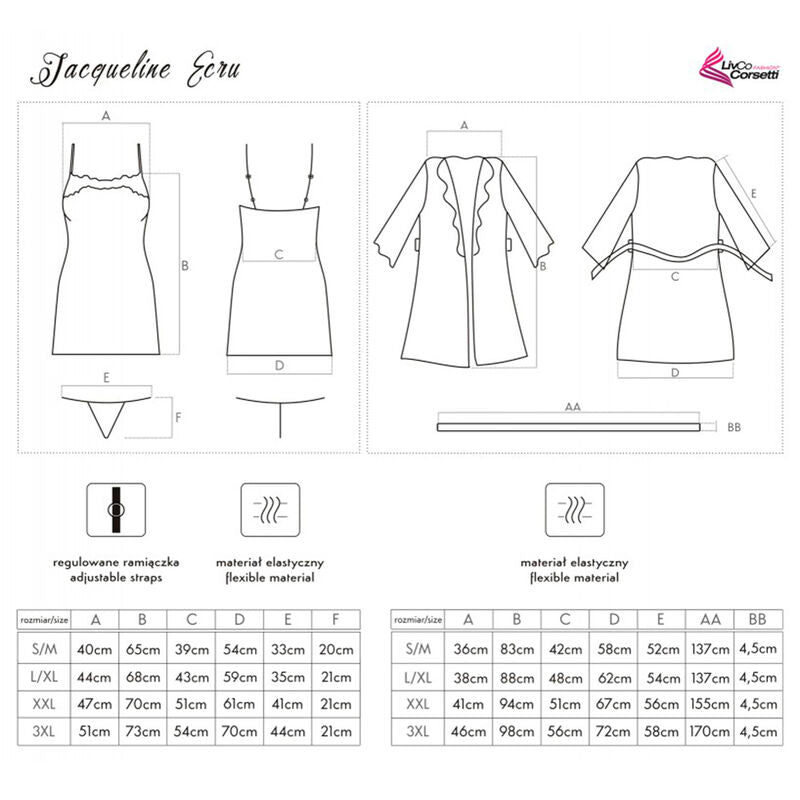 An exceptionally beautiful set of underwear made of shiny ecru satin, a bathrobe with a chemise, reaching to mid-thigh. The front and long sleeves of the dressing gown tied at the waist with a belt are decorated with beautiful lace. T-shirt with thin, adjustable straps, decorated with the same lace at the bust. Thong included.